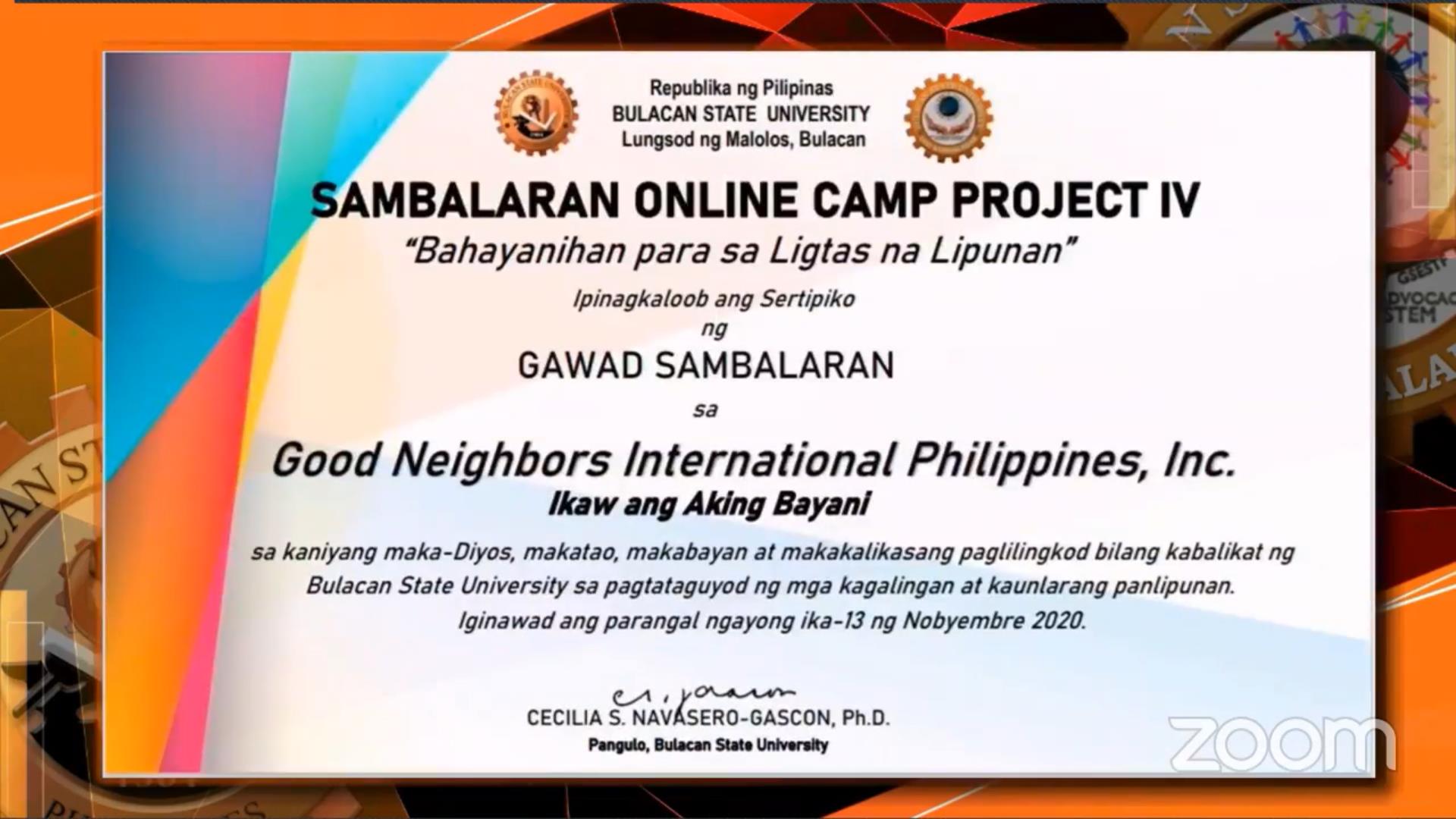 Good Neighbors International Philippines (GNIP) was recognized in the 4th Gawad Samabaralan (Sama na sa Pambayang Kaunlaran) of the Bulacan State Univerisity. This award acknowledges the steadfast commitment and compassion of the GNIP Bulacan Field Office in providing services to communities despite the challenges brought about COVID-19 pandemic and natural disasters.